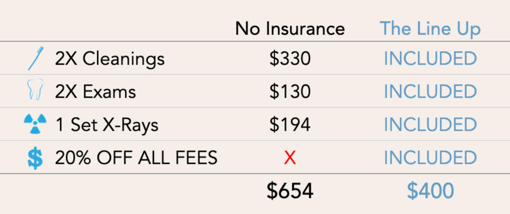 The Lineup is a simple membership plan for those without insurance to manage your dental care with complete transparency. The plan is entirely in-house and a direct relationship between you and Blue Line Dental. There is no third-party company to deal with which means no additional fees or complications.